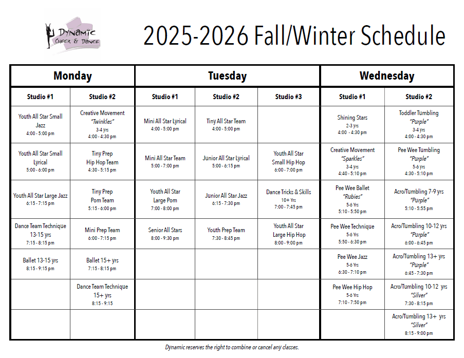 - Dynamic Cheer & Dance has the right to change, combine or cancel any class.
